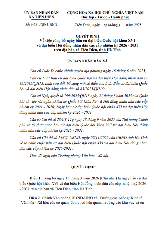 Về việc công bố ngày bầu cử đại biểu Quốc hội khóa XVI và đại biểu Hội đồng nhân dân các cấp nhiệm kỳ 2026 - 2031 trên địa bàn xã Tiên Điền, tỉnh Hà Tĩnh