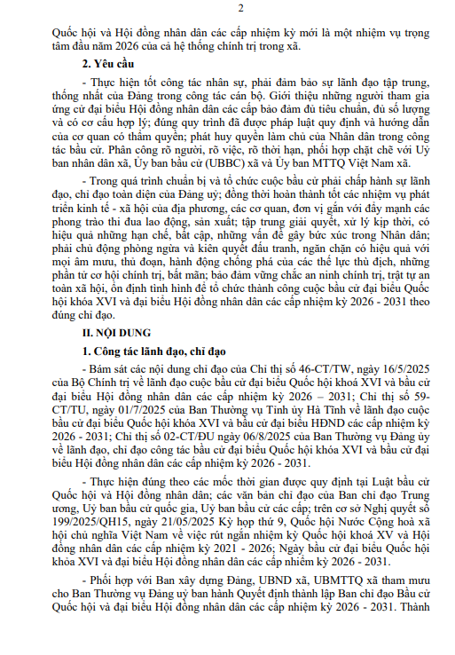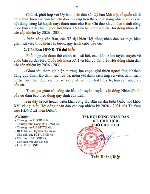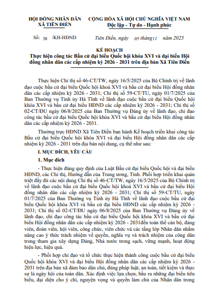 Kế hoạch Thực hiện công tác Bầu cử đại biểu Quốc hội khóa XVI và đại biểu Hội đồng nhân dân các cấp nhiệm kỳ 2026 - 2031 trên địa bàn Xã Tiên Điền