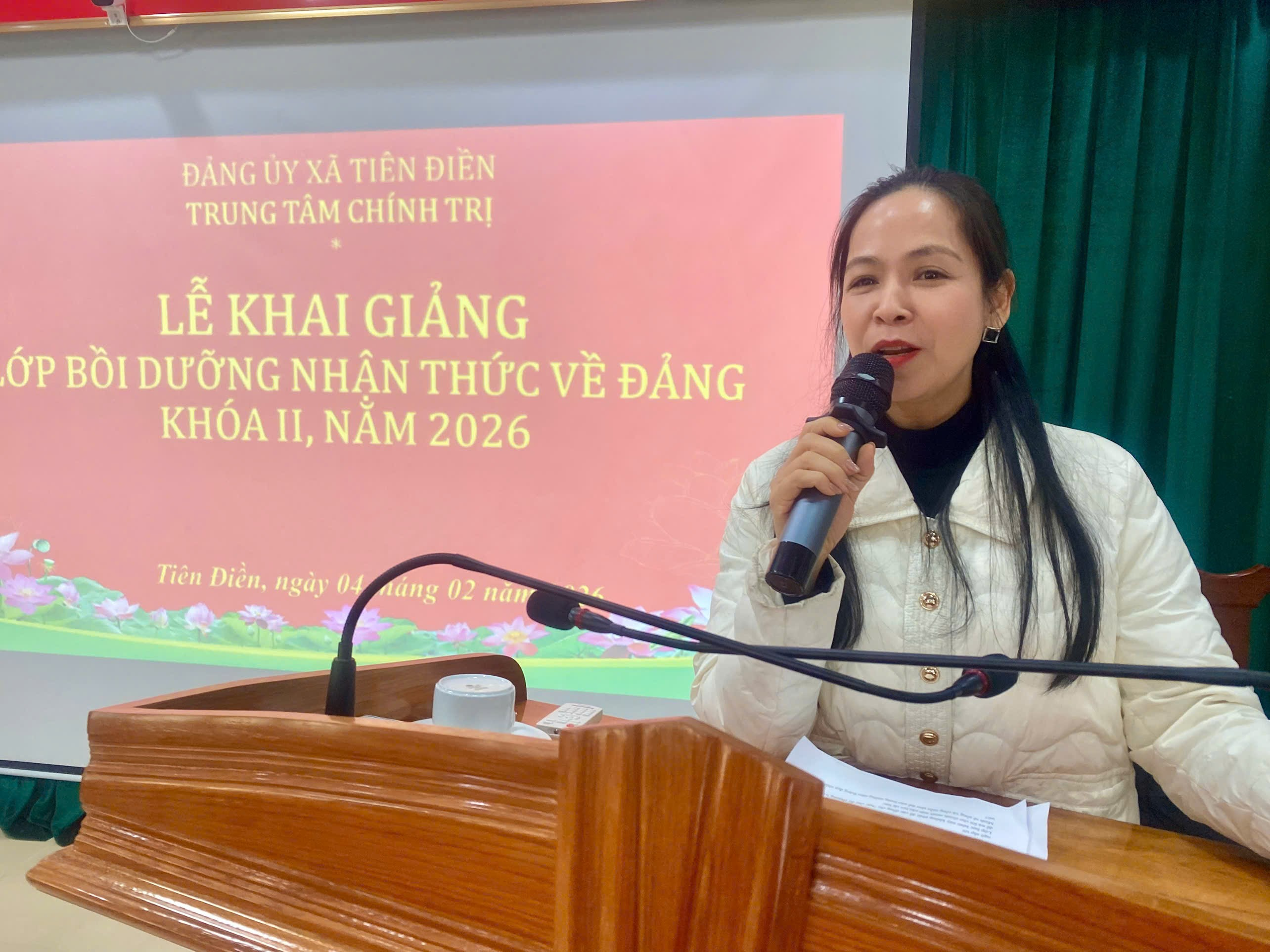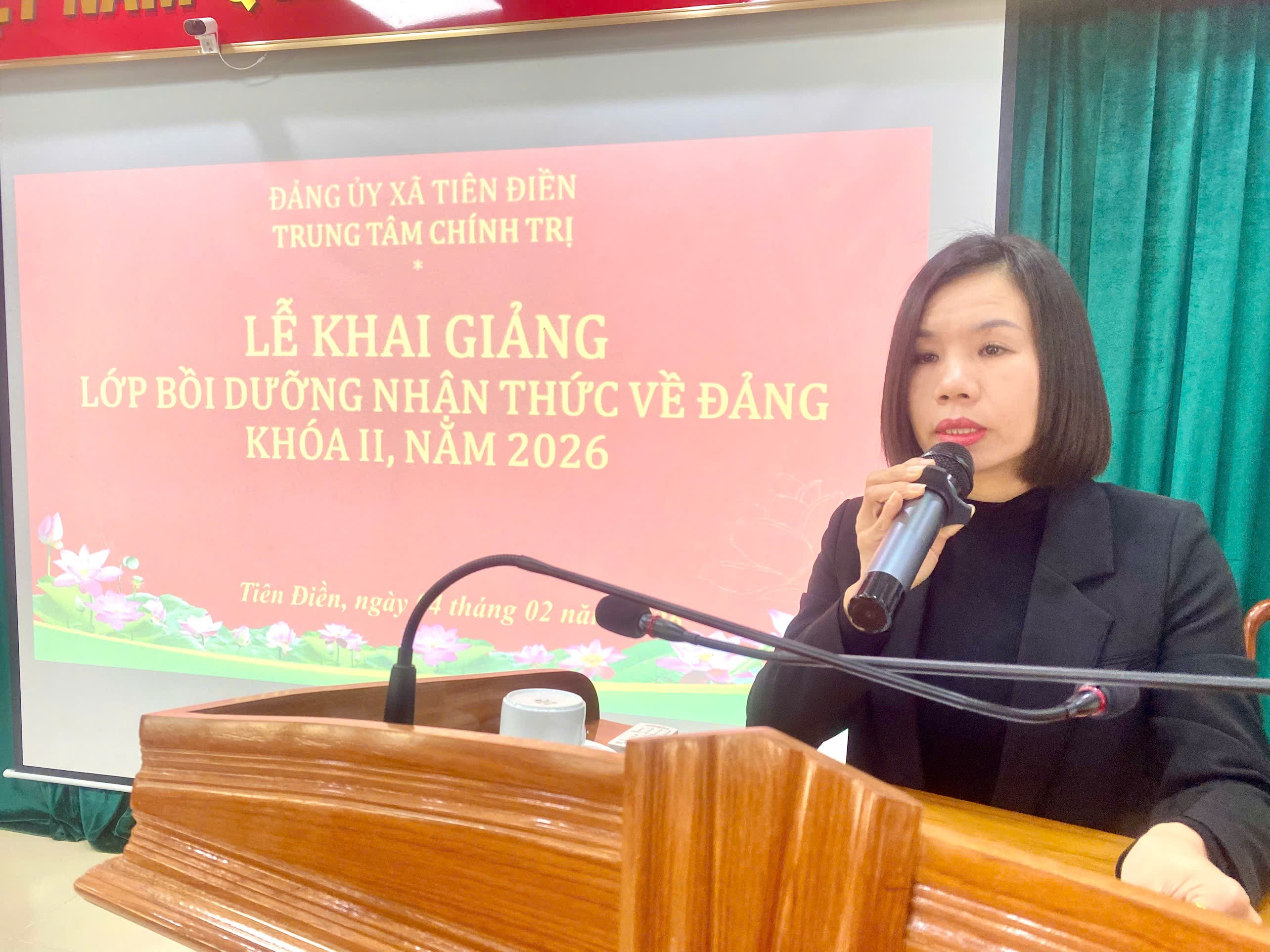Phát biểu tại Lễ khai giảng, đồng chí Nguyễn Thị Huyền - UVBCH Đảng bộ - Giám đốc Trung tâm chính trị nhấn mạnh: Việc tổ chức lớp bồi dưỡng nhận thức về Đảng cho thanh niên nhập ngũ có ý nghĩa đặc biệt quan trọng, góp phần bồi dưỡng lý tưởng cách mạng, nâng cao nhận thức chính trị, củng cố niềm tin vào sự lãnh đạo của Đảng, tạo nền tảng tư tưởng vững chắc cho thanh niên trước khi bước vào môi trường rèn luyện, kỷ luật nghiêm minh của lực lượng vũ trang.