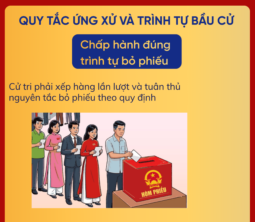 Những quy định nào áp dụng tại phòng bỏ phiếu bầu cử?admin14/03/2026A -A+admin14/03/2026A -A+Khi đi bầu cử, cử tri phải chấp hành đúng nguyên tắc, trình tự bỏ phiếu; không được vận động bầu cử tại nơi bỏ phiếu dưới bất kỳ hình thức nào. Nguôn: Báo Hà Tĩnh