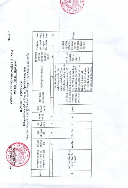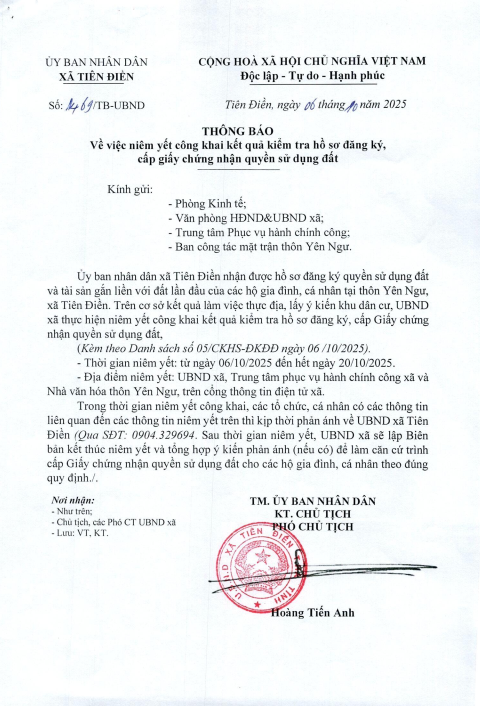 Niêm yết công khai kết quả hồ sơ đăng ký, cấp giấy chứng nhận quyền sử dụng đất.PKT06/10/2025A -A+PKT06/10/2025A -A+Niêm yết công khai kết quả hồ sơ đăng ký, cấp giấy chứng nhận quyền sử dụng đất.