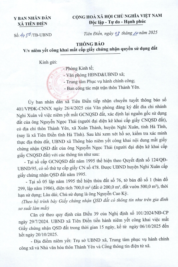 Niêm yết công khai mất giấy chứng nhận quyền sử dụng ĐấtPhòng KT06/10/2025A -A+Phòng KT06/10/2025A -A+Niêm yết công khai mất giấy chứng nhận quyền sử dụng ĐấtFile đính kèmthông báo mất GCN QSD đất Nguyễn Ngọc Thái_0001.pdf