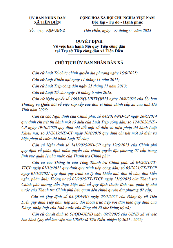 Nội quy Tiếp công dân tại Trụ sở Tiếp công dân xã Tiên Điềnadmin27/11/2025A -A+admin27/11/2025A -A+QUYẾT ĐỊNH Về việc ban hành Nội quy Tiếp công dân tại Trụ sở Tiếp công dân xã Tiên Điền File đính kèmQuyet-dinh-ban-hanh-Noi-quy-tiep-cong-dan-xa-Tien-Dien_chuonghvtiendien-26-11-2025_21h29p15(27.11.2025_07h40p13)_signed.pdf
