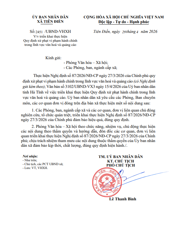 Quy định xử phạt vi phạm hành chính trong lĩnh vực văn hoá và quảng cáoAdmin29/04/2026A -A+Admin29/04/2026A -A+Quy định xử phạt vi phạm hành chính trong lĩnh vực văn hoá và quảng cáo https://hscvht2.hatinh.gov.vn/xtiendien/vbdi.nsf/str/0DF168F71B459D7847258DE8002A4B3B/$file/27.4.2026-Nghi-dinh-87-Quy-dinh-xu-phat-hanh-chinh-trong-linh-vuc-van-hoa-va-Quang-cao.pdfFile đính kèmKhông được xác nhận 463108.crdownload