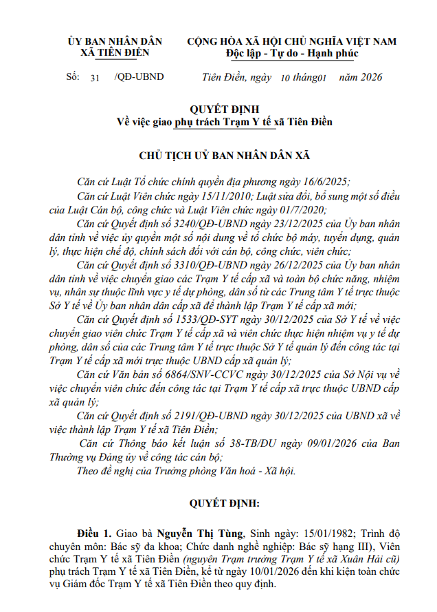 Quyết định Về việc giao phụ trách Trạm Y tế xã Tiên Điềnadmin12/01/2026A -A+admin12/01/2026A -A+UBND xã Tiên Điền ban hành quyết định Số: 31 /QĐ-UBND Quyết định Về việc giao phụ trách Trạm Y tế xã Tiên ĐiềnFile đính kèm10.01.-QD-giao-phu-trach-tram-y-te-xa-Tien-Dien_linhpvtiendien-10-01-2026_10h16p12(10.01.2026_14h33p34)_signed.pdf
