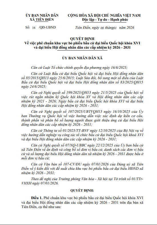 UBND xã Tiên Điền ban hành Quyết định Số: 16 /QĐ-UBND ngày 08 tháng 01 năm 2026