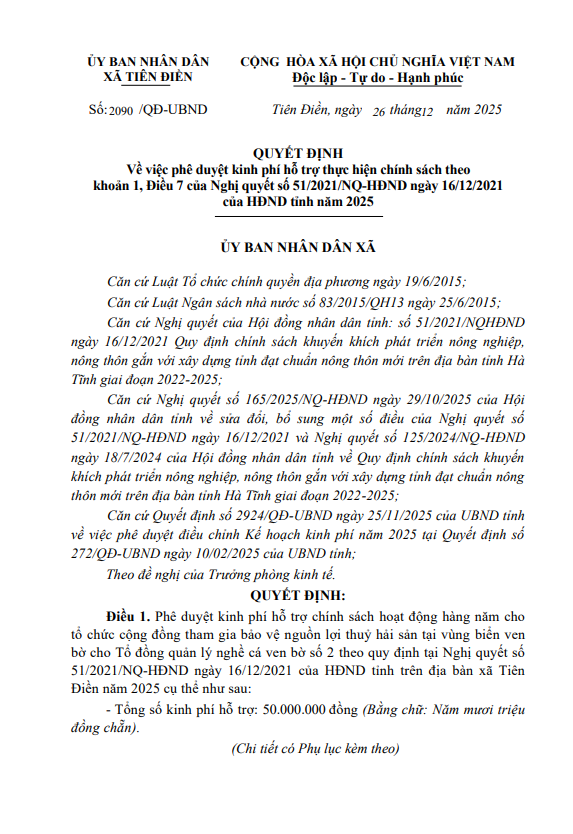 Về việc phê duyệt kinh phí hỗ trợ thực hiện chính sách theo khoản 1, Điều 7 của Nghị quyết số 51/2021/NQ-HĐND ngày 16/12/2021 của HĐND tỉnh năm 2025