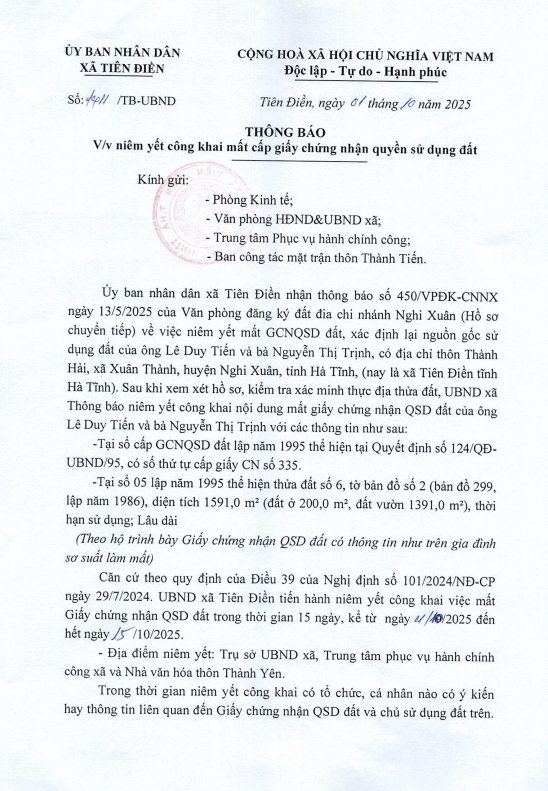 THÔNG BÁO CÔNG KHAIadmin02/10/2025A -A+admin02/10/2025A -A+NIÊM YẾT CÔNG KHAI GIẤY CHỨNG NHẬN QUYỀN SỬ DỤNG ĐẤTFile đính kèmHỒ SƠ NIÊM YẾT MẤT GCN LÊ DUY TIẾN_0001.pdf
