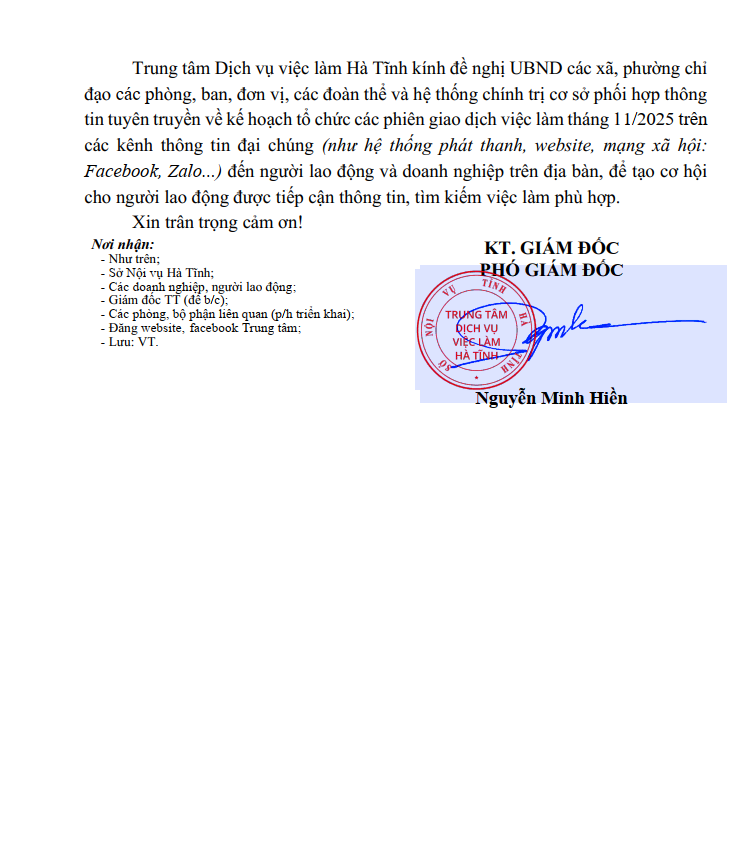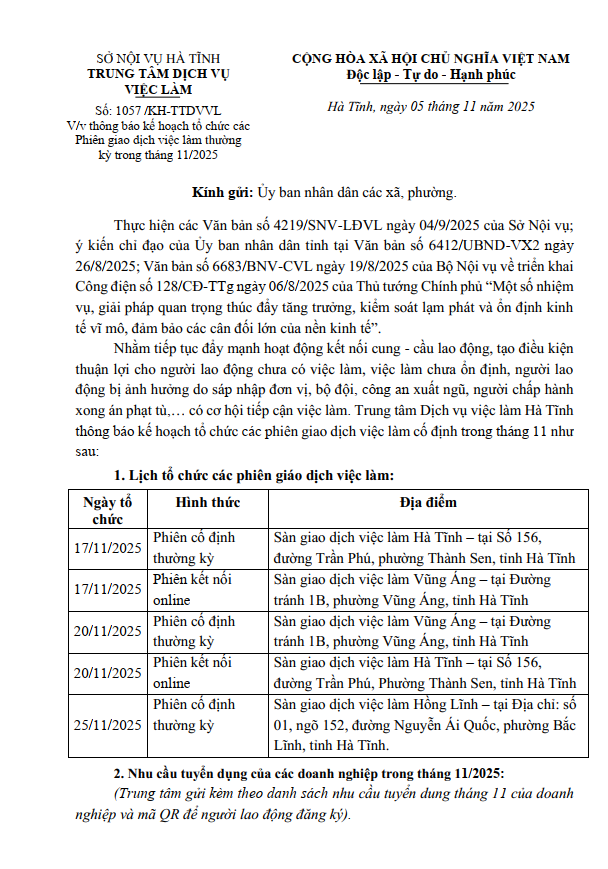 Thông báo kế hoạch tổ chức các Phiên giao dịch việc làm thường kỳ trong tháng 11/2025