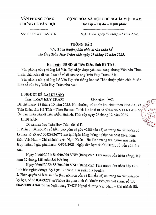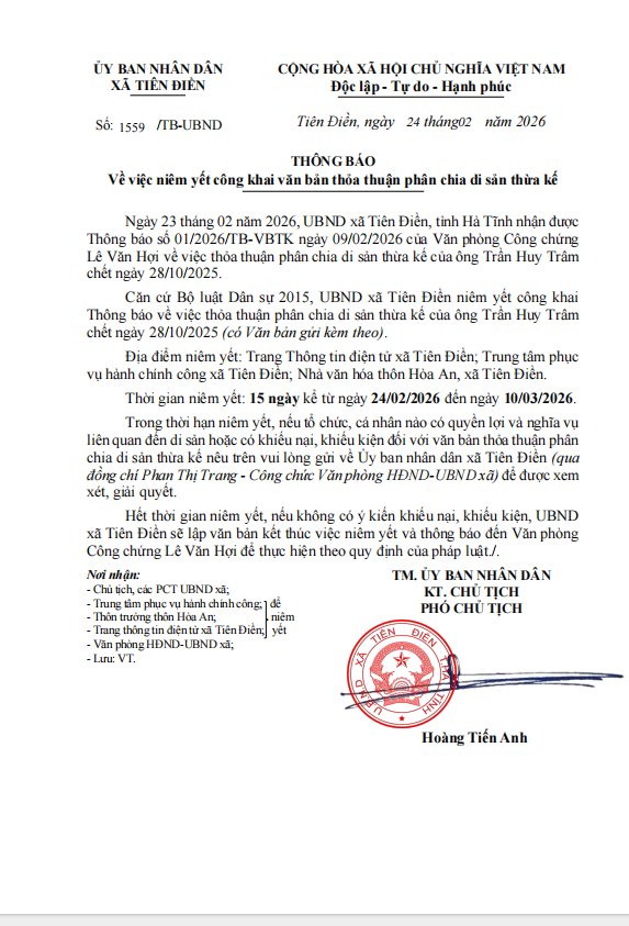 THÔNG BÁO NIÊM YẾT CÔNG KHAIadmin27/02/2026A -A+admin27/02/2026A -A+Niêm yết công khai văn bản chia thỏa thuận thừa kế