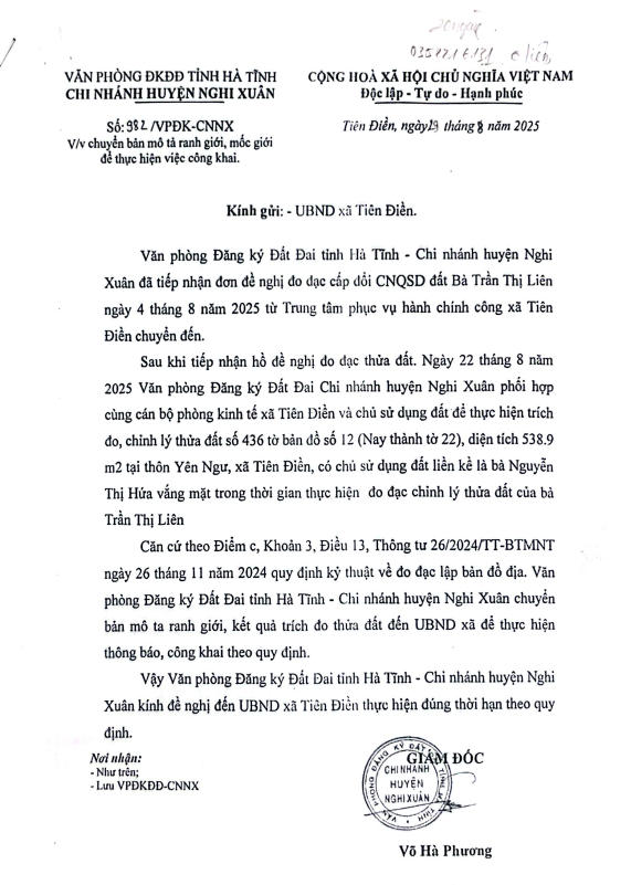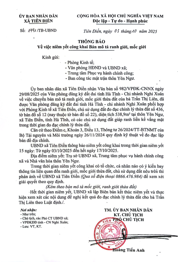 THÔNG BÁO NIÊM YẾT CÔNG KHAI BẢN MÔ TẢ, RANH GIỚI, MỐC GIỚIadmin03/10/2025A -A+admin03/10/2025A -A+...File đính kèm03.10.25 TB Niem yet ba Tran Thi Lien thon Yen Ngu.pdf