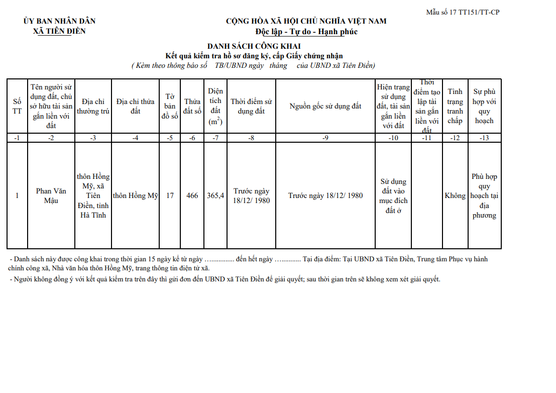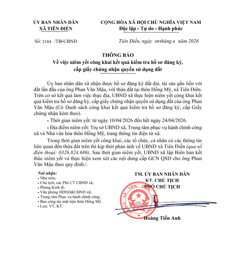 Thông báo niêm yết công khai kết quả kiểm tra đăng ký, cấp giấy chứng nhận quyền sử dụng đấtAdmin13/04/2026A -A+Admin13/04/2026A -A+Thông báo niêm yết công khai kết quả kiểm tra đăng ký, cấp giấy chứng nhận quyền sử dụng đất