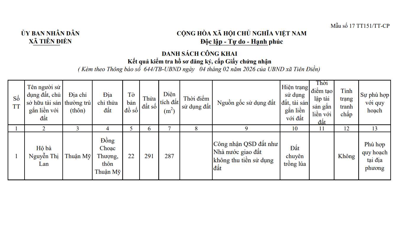 Thống báo niêm yết công khai kết quả kiểm tra hồ sơ đăng ký, cấp giấy chứng nhận quyền sử dụng đấtAdmin05/02/2026A -A+Admin05/02/2026A -A+THÔNG BÁO V/v niêm yết công khai kết quả kiểm tra hồ sơ đăng ký, cấp giấy chứng nhận quyền sử dụng đất