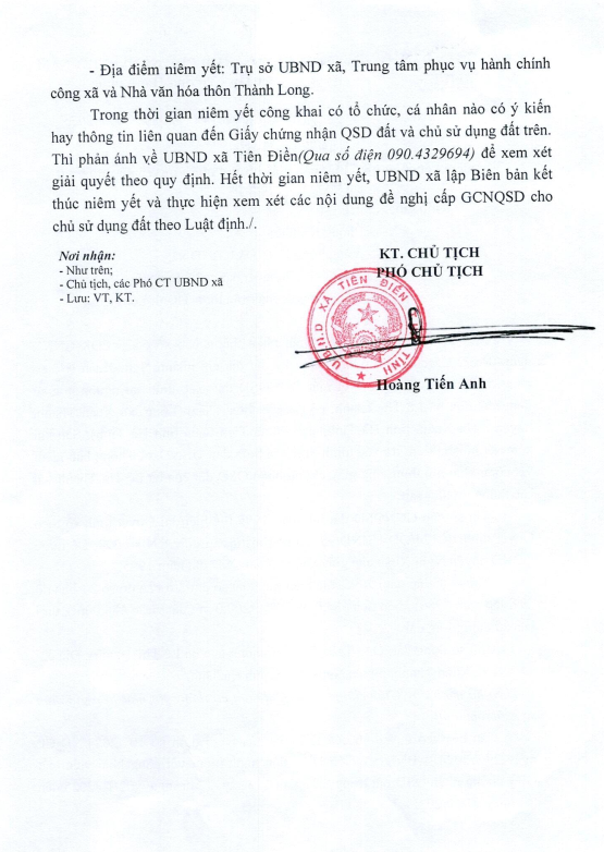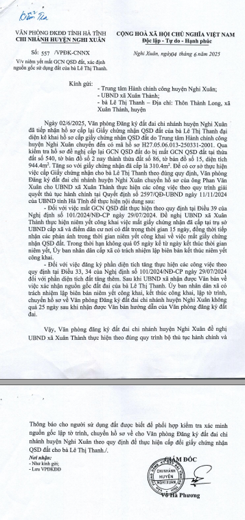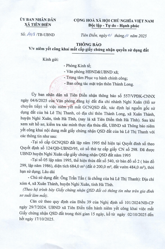 Thông báo niêm yết công khai mất GCN bà Lê Thị Thanhadmin02/10/2025A -A+admin02/10/2025A -A+Niêm yết công khai mất giấy chứng nhận quyền sử dụng đất.File đính kèmHỒ SƠ NIÊM YẾT MẤT GCN LÊ THỊ THANH_0001.pdf
