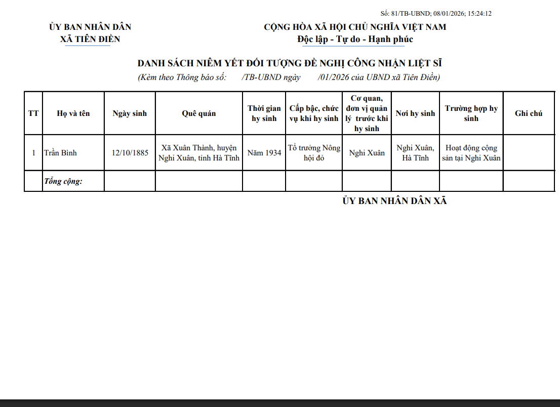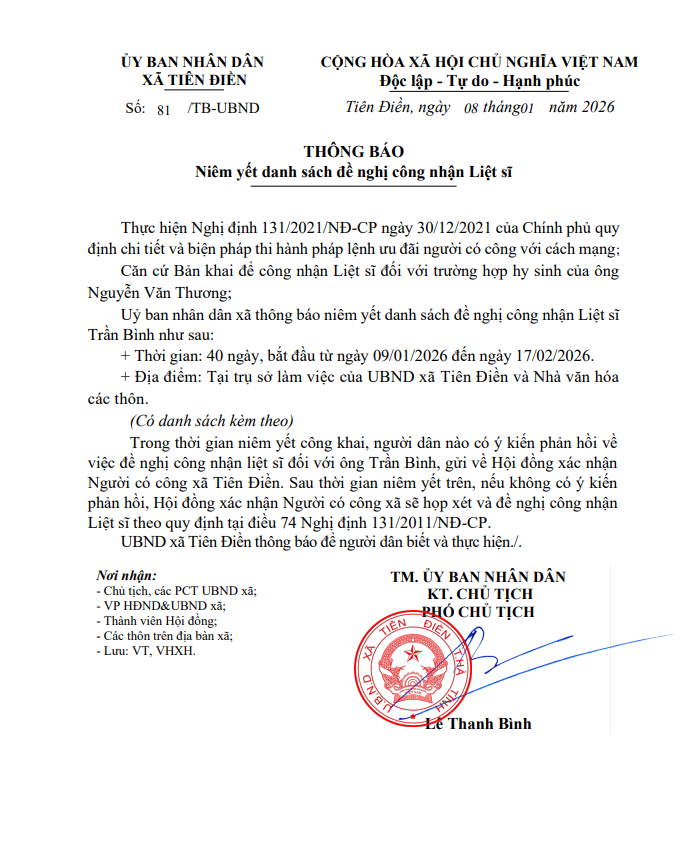 THÔNG BÁO Niêm yết danh sách đề nghị công nhận Liệt sĩadmin09/01/2026A -A+admin09/01/2026A -A+UBND xã Tiên Điền thông báo số 81 TB-UBND về Niêm yết danh sách đề nghị công nhận Liệt sĩ