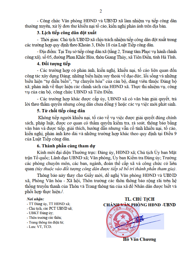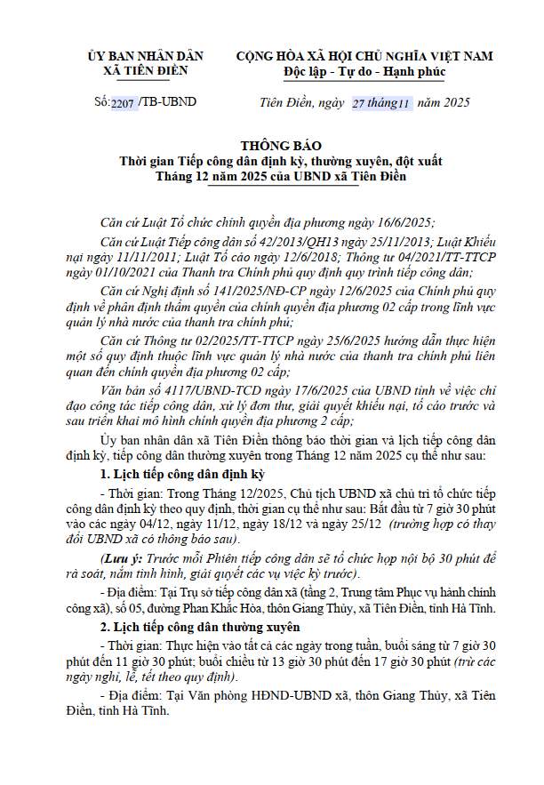 THÔNG BÁO Thời gian Tiếp công dân định kỳ, thường xuyên, đột xuất Tháng 12 năm 2025 của UBND xã Tiên Điềnadmin01/12/2025A -A+admin01/12/2025A -A+THÔNG BÁO Thời gian Tiếp công dân định kỳ, thường xuyên, đột xuất Tháng 12 năm 2025 của UBND xã Tiên Điền