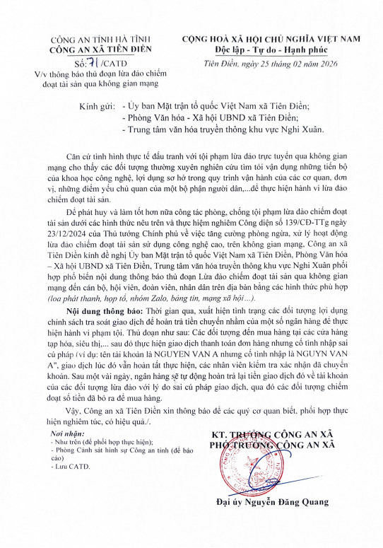 Thông báo thủ đoạn lừa đảo chiếm đoạt tài sản qua không gian mạngadmin27/02/2026A -A+admin27/02/2026A -A+ Công an xã Tiên Điền thông báo thủ đoạn lừa đảo chiếm đoạt tài sản qua không gian mạng