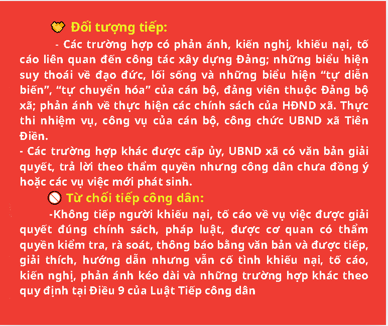 Tin liên quanCơ cấu tổ chức UBND xã Tiên ĐiềnKHAI GIẢNG LỚP BỒI DƯỠNG NHẬN THỨC VỀ ĐẢNG KHÓA 2, NĂM 2026Thông báo Về việc niêm yết danh sách cử tri bầu cử đại biểu Quốc Hội khoá XVI và đại biểu HĐND các cấp, nhiệm kỳ 2026-2031THÔNG BÁO Tiếp công dân định kỳ tháng 02 năm 2026Đặc sắc chương trình nghệ thuật “Mùa xuân dâng Đảng" tại xã Tiên Điền