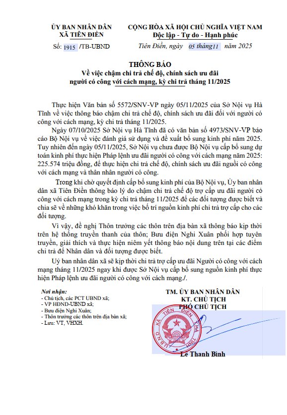 THÔNG BÁO Về việc chậm chi trả chế độ, chính sách ưu đãi người có công với cách mạng, kỳ chi trả tháng 11/2025admin07/11/2025A -A+admin07/11/2025A -A+UBND xã Tiên Điền thông báo Về việc chậm chi trả chế độ, chính sách ưu đãi người có công với cách mạng, kỳ chi trả tháng 11/2025