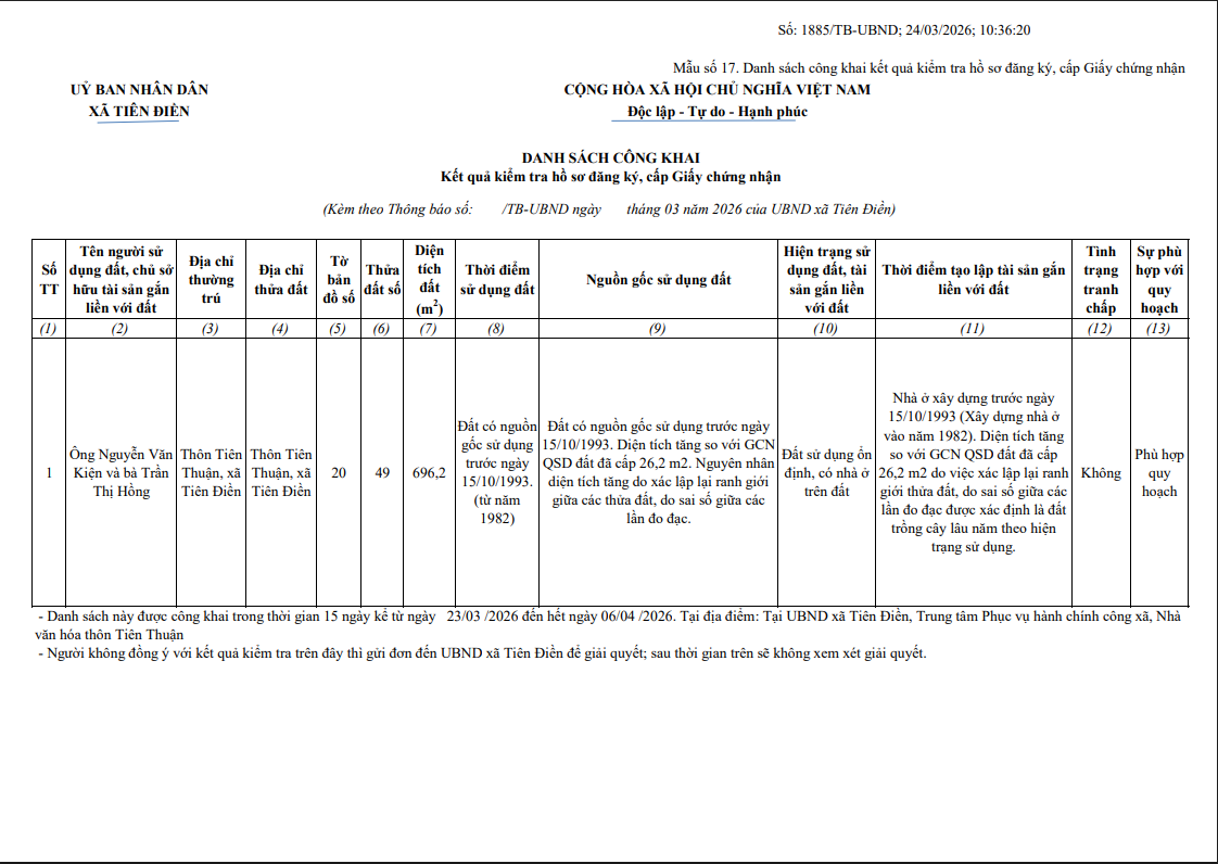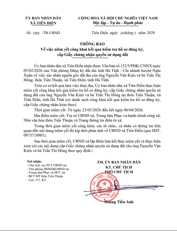 THÔNG BÁO Về việc niêm yết công khai kết quả kiểm tra hồ sơ đăng ký, cấp Giấy chứng nhận quyền sử dụng đất Admin30/03/2026A -A+Admin30/03/2026A -A+THÔNG BÁO Về việc niêm yết công khai kết quả kiểm tra hồ sơ đăng ký, cấp Giấy chứng nhận quyền sử dụng đất