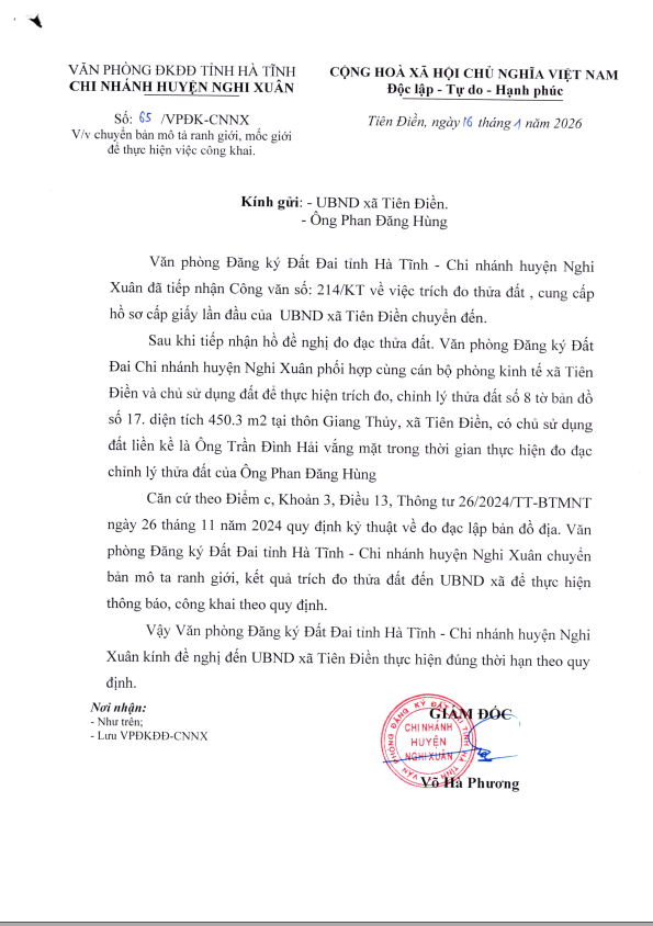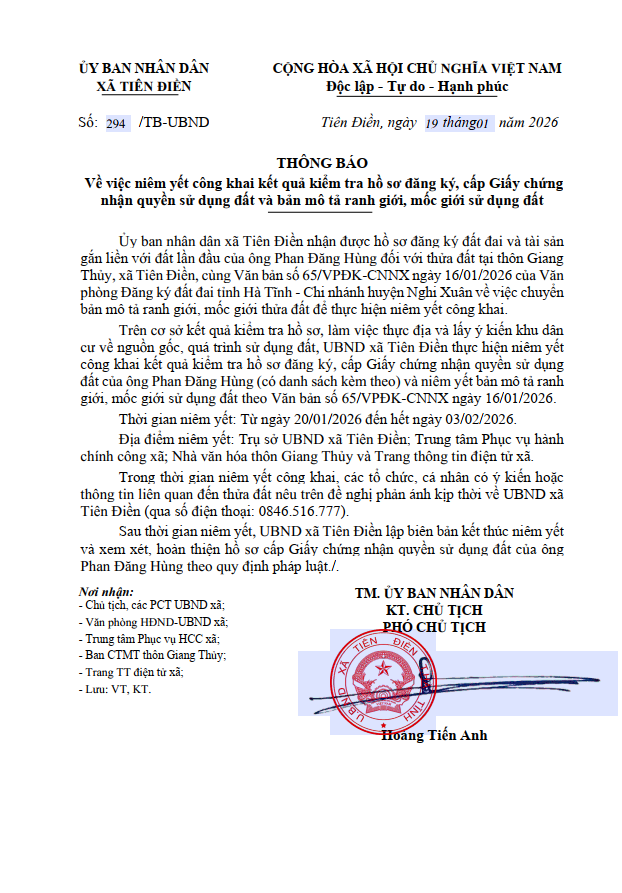THÔNG BÁO Về việc niêm yết công khai kết quả kiểm tra hồ sơ đăng ký, cấp Giấy chứng nhận quyền sử dụng đất và bản mô tả ranh giới, mốc giới sử dụng đất