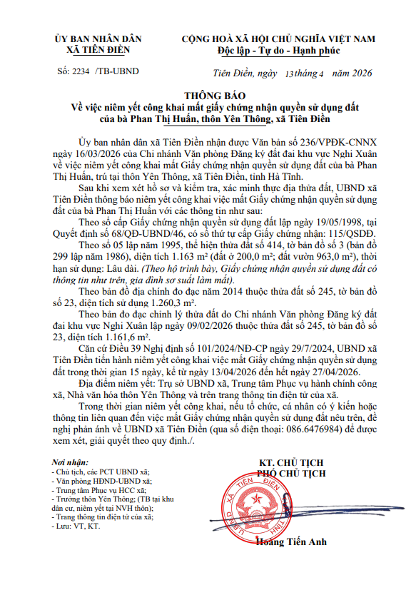 THÔNG BÁO Về việc niêm yết công khai mất giấy chứng nhận quyền sử dụng đất của bà Phan Thị Huấn, thôn Yên Thông, xã Tiên ĐiềnAdmin13/04/2026A -A+Admin13/04/2026A -A+THÔNG BÁO Về việc niêm yết công khai mất giấy chứng nhận quyền sử dụng đất của bà Phan Thị Huấn, thôn Yên Thông, xã Tiên Điền