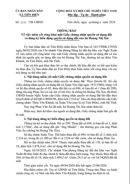 THÔNG BÁO Về việc niêm yết công khai mất Giấy chứng nhận quyền sử dụng đất và đăng ký biến động quyền sử dụng đất của bà Hoàng Thị XinAdmin09/04/2026A -A+Admin09/04/2026A -A+THÔNG BÁO Về việc niêm yết công khai mất Giấy chứng nhận quyền sử dụng đất và đăng ký biến động quyền sử dụng đất của bà Hoàng Thị Xin