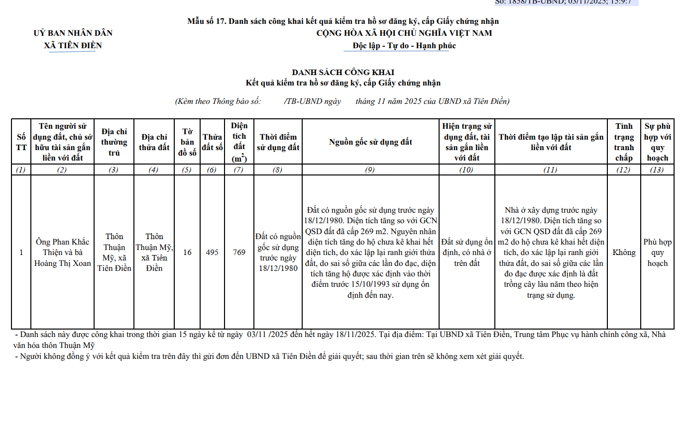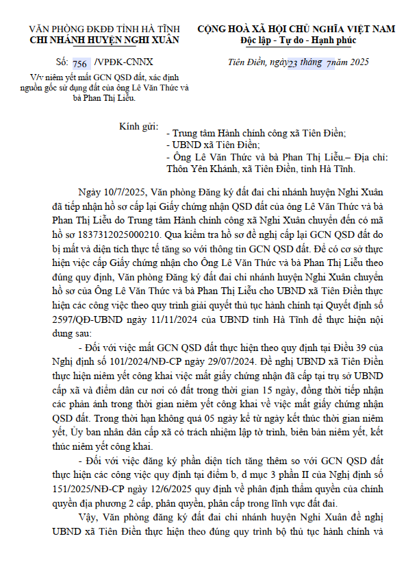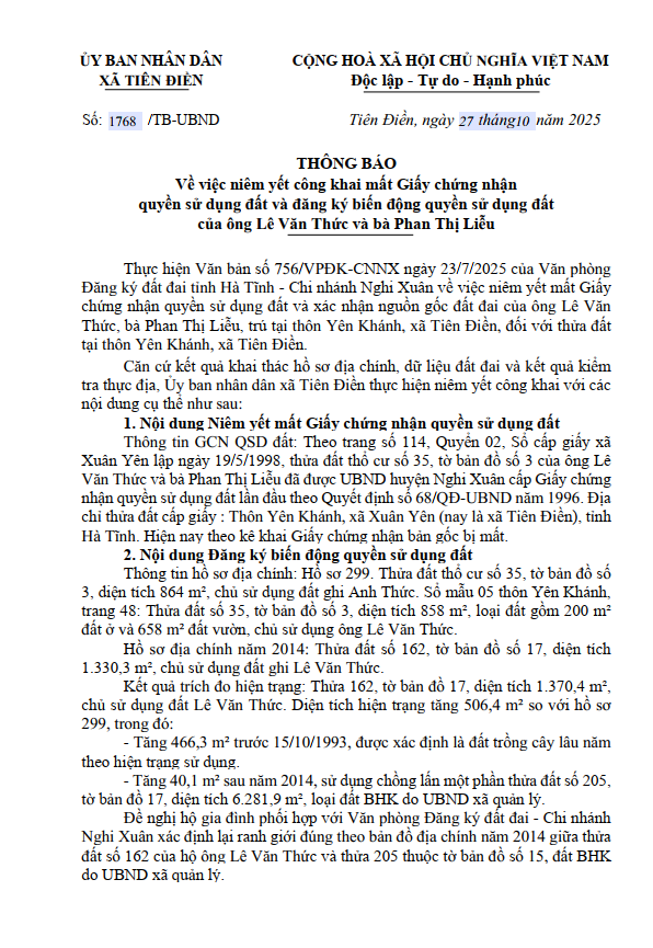 THÔNG BÁO Về việc niêm yết công khai mất Giấy chứng nhận quyền sử dụng đất và đăng ký biến động quyền sử dụng đất của ông Lê Văn Thức và bà Phan Thị Liễu