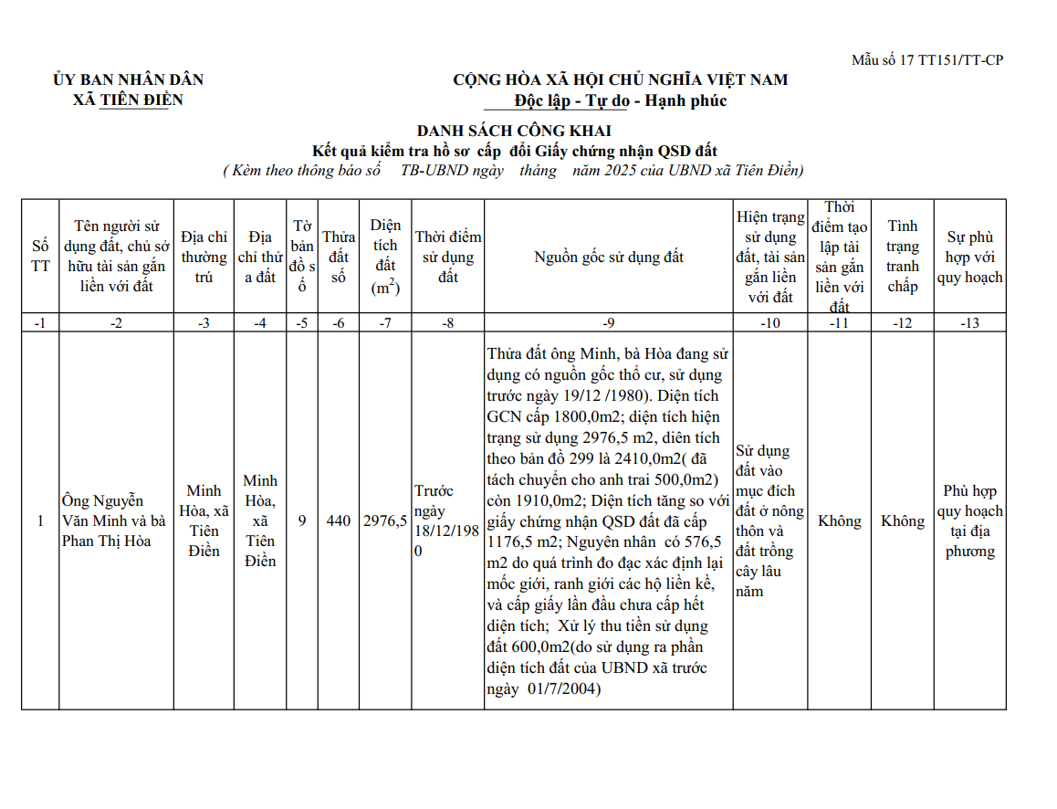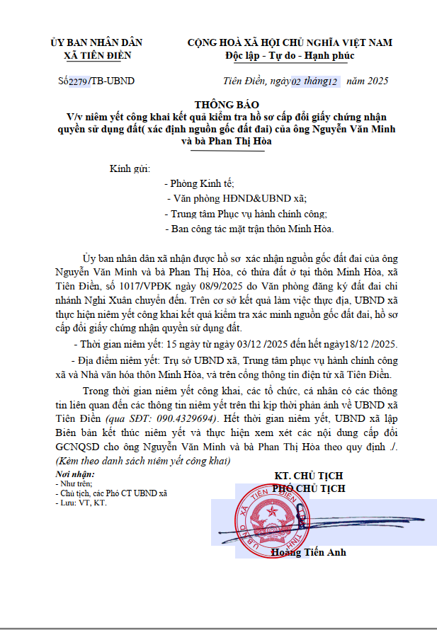 V/v niêm yết công khai kết quả kiểm tra hồ sơ cấp đổi giấy chứng nhận quyền sử dụng đất( xác định nguồn gốc đất đai) của ông Nguyễn Văn Minh và bà Phan Thị Hòa