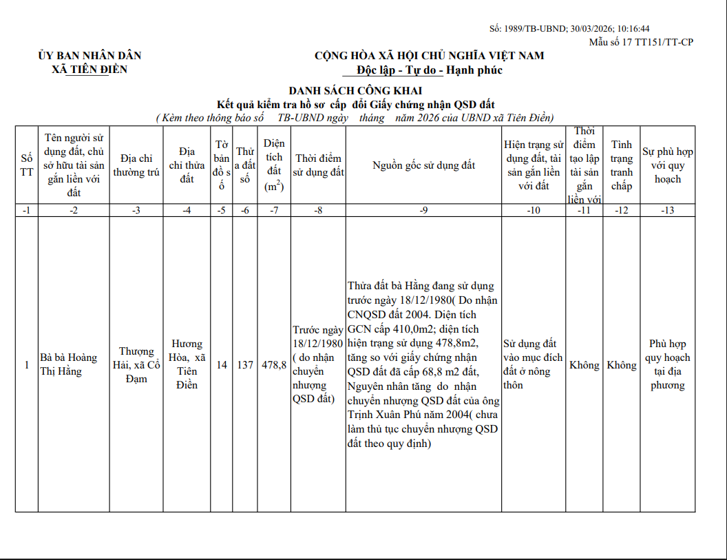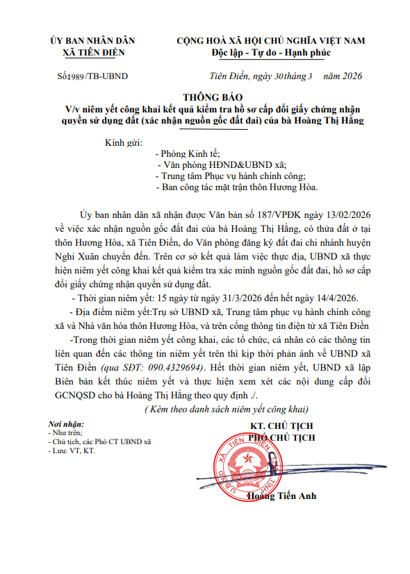 THÔNG BÁO V/v niêm yết công khai kết quả kiểm tra hồ sơ cấp đổi giấy chứng nhận quyền sử dụng đất (xác nhận nguồn gốc đất đai) của bà Hoàng Thị Hằng