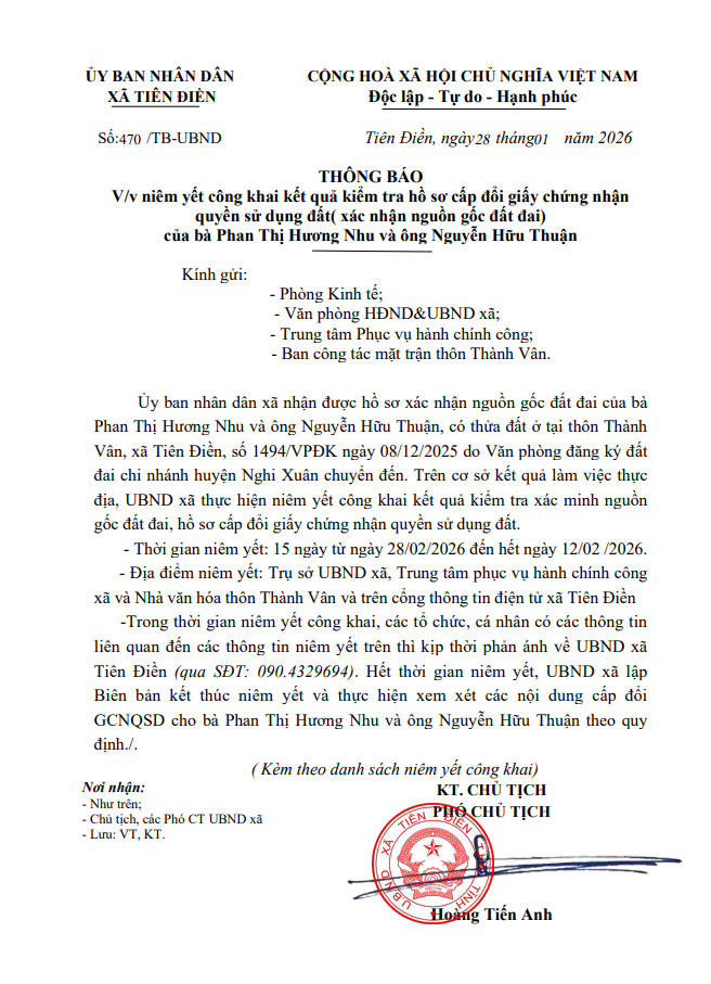 THÔNG BÁO V/v niêm yết công khai kết quả kiểm tra hồ sơ cấp đổi giấy chứng nhận quyền sử dụng đất( xác nhận nguồn gốc đất đai) của bà Phan Thị Hương Nhu và ông Nguyễn Hữu Thuận