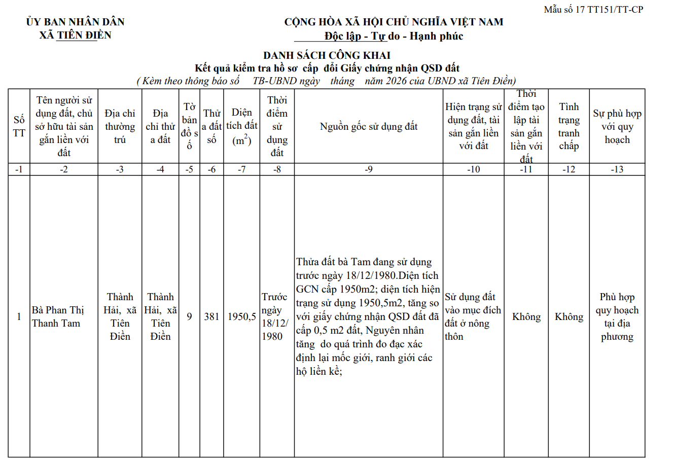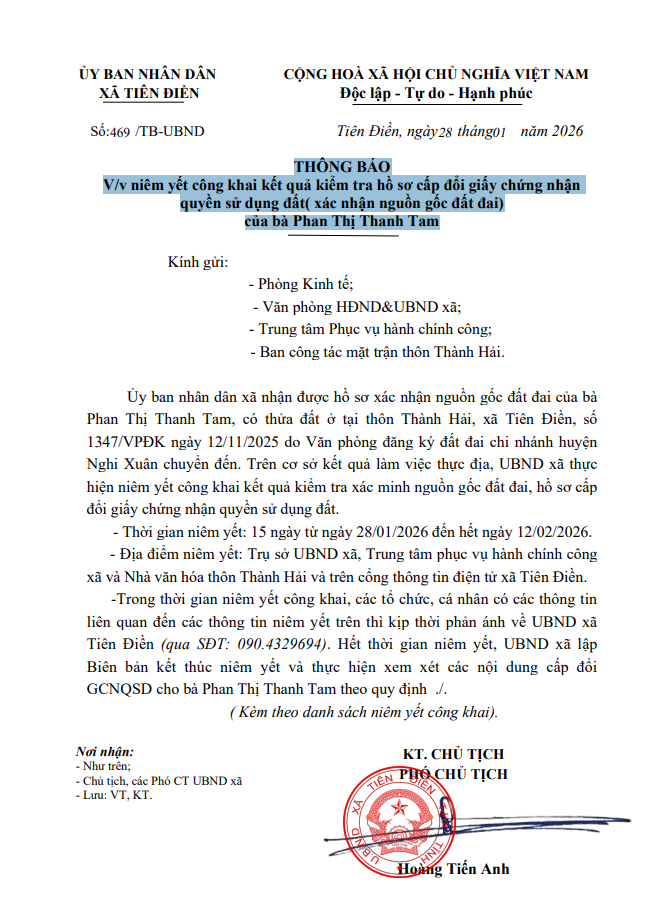THÔNG BÁO V/v niêm yết công khai kết quả kiểm tra hồ sơ cấp đổi giấy chứng nhận quyền sử dụng đất( xác nhận nguồn gốc đất đai) của bà Phan Thị Thanh Tam