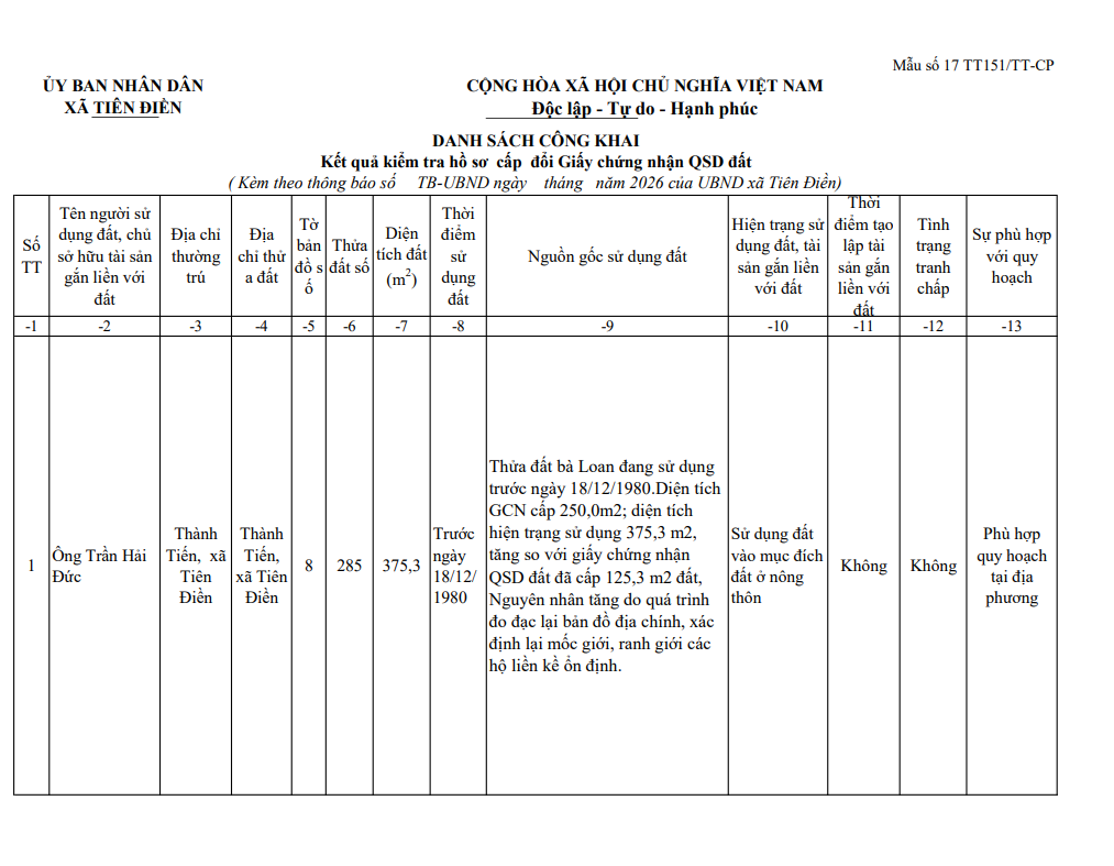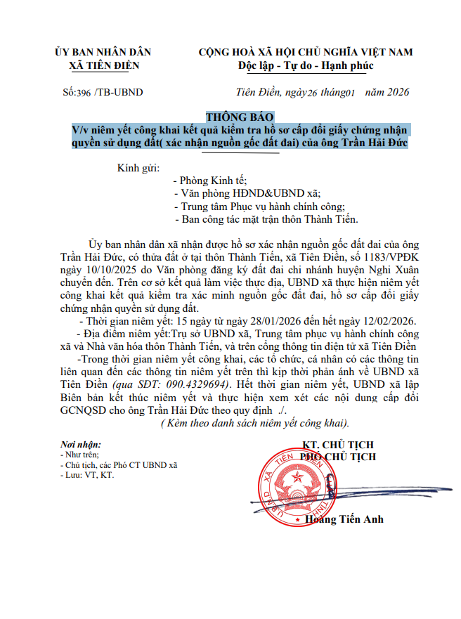 THÔNG BÁO V/v niêm yết công khai kết quả kiểm tra hồ sơ cấp đổi giấy chứng nhận quyền sử dụng đất( xác nhận nguồn gốc đất đai) của ông Trần Hải Đức
