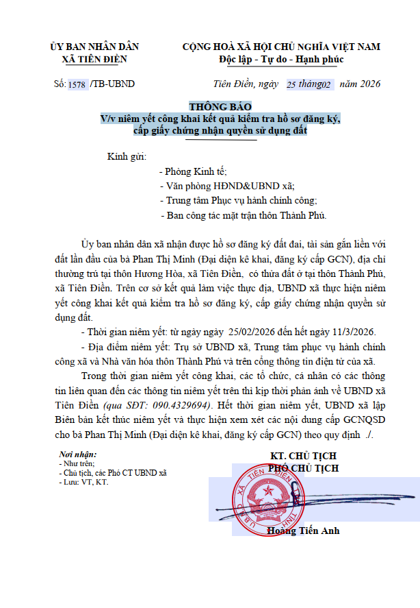 THÔNG BÁO V/v niêm yết công khai kết quả kiểm tra hồ sơ đăng ký, cấp giấy chứng nhận quyền sử dụng đấtadmin27/02/2026A -A+admin27/02/2026A -A+THÔNG BÁO V/v niêm yết công khai kết quả kiểm tra hồ sơ đăng ký, cấp giấy chứng nhận quyền sử dụng đất
