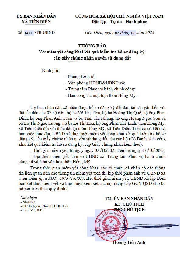 Thông báo V/v niêm yết công khai kết quả kiểm tra hồ sơ đăng ký, cấp giấy chứng nhận quyền sử dụng đất.admin03/10/2025A -A+admin03/10/2025A -A+V/v niêm yết công khai kết quả kiểm tra hồ sơ đăng ký, cấp giấy chứng nhận quyền sử dụng đấtFile đính kèm1.-TB-niem-yet_chuonghvtiendien-02-10-2025_16h20p59(02.10.2025_19h39p42)_signed.pdf2. DS niêm yết.pdf