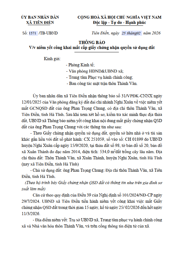 THÔNG BÁO V/v niêm yết công khai mất cấp giấy chứng nhận quyền sử dụng đấtadmin26/02/2026A -A+admin26/02/2026A -A+THÔNG BÁO V/v niêm yết công khai mất cấp giấy chứng nhận quyền sử dụng đất