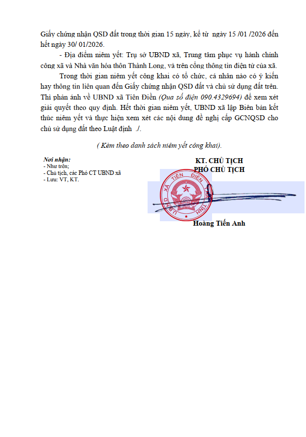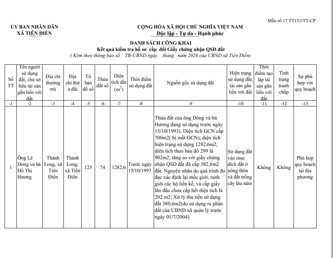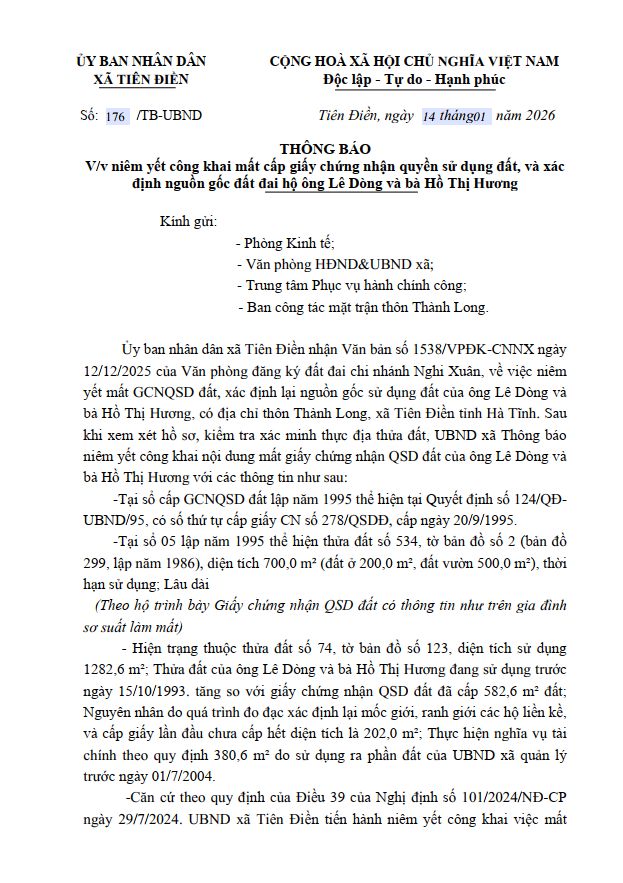 Thông báo V/v niêm yết công khai mất cấp giấy chứng nhận quyền sử dụng đất, và xác định nguồn gốc đất đai hộ ông Lê Dòng và bà Hồ Thị Hương