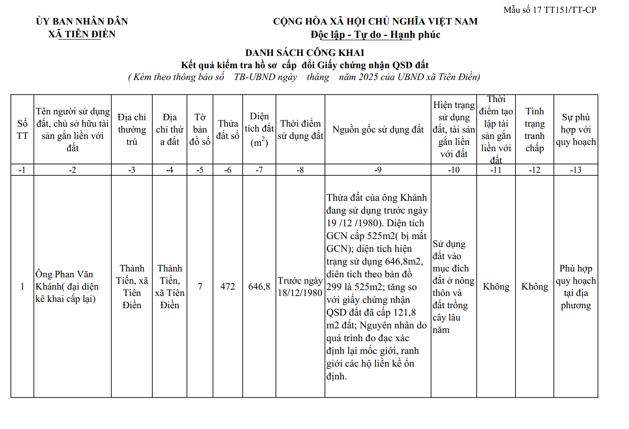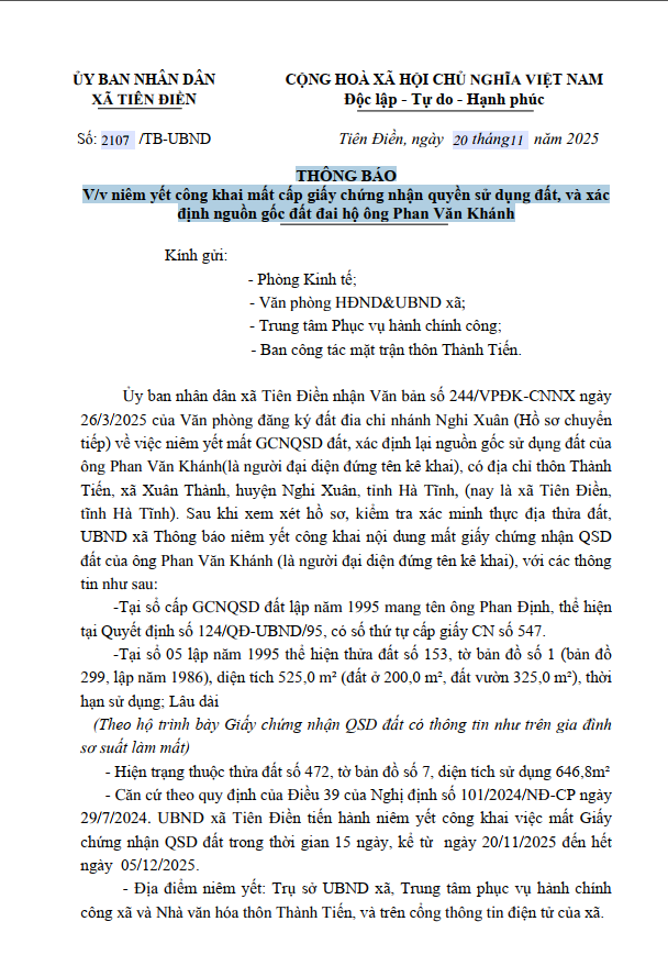 THÔNG BÁO V/v niêm yết công khai mất cấp giấy chứng nhận quyền sử dụng đất, và xác định nguồn gốc đất đai hộ ông Phan Văn Khánhadmin21/11/2025A -A+admin21/11/2025A -A+THÔNG BÁO V/v niêm yết công khai mất cấp giấy chứng nhận quyền sử dụng đất, và xác định nguồn gốc đất đai hộ ông Phan Văn Khánh
