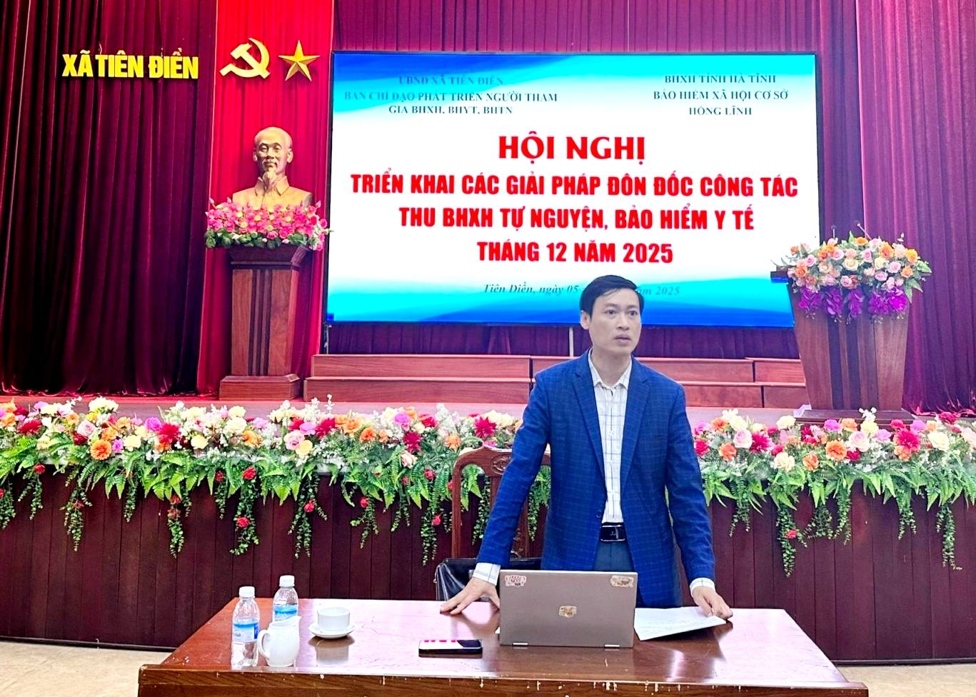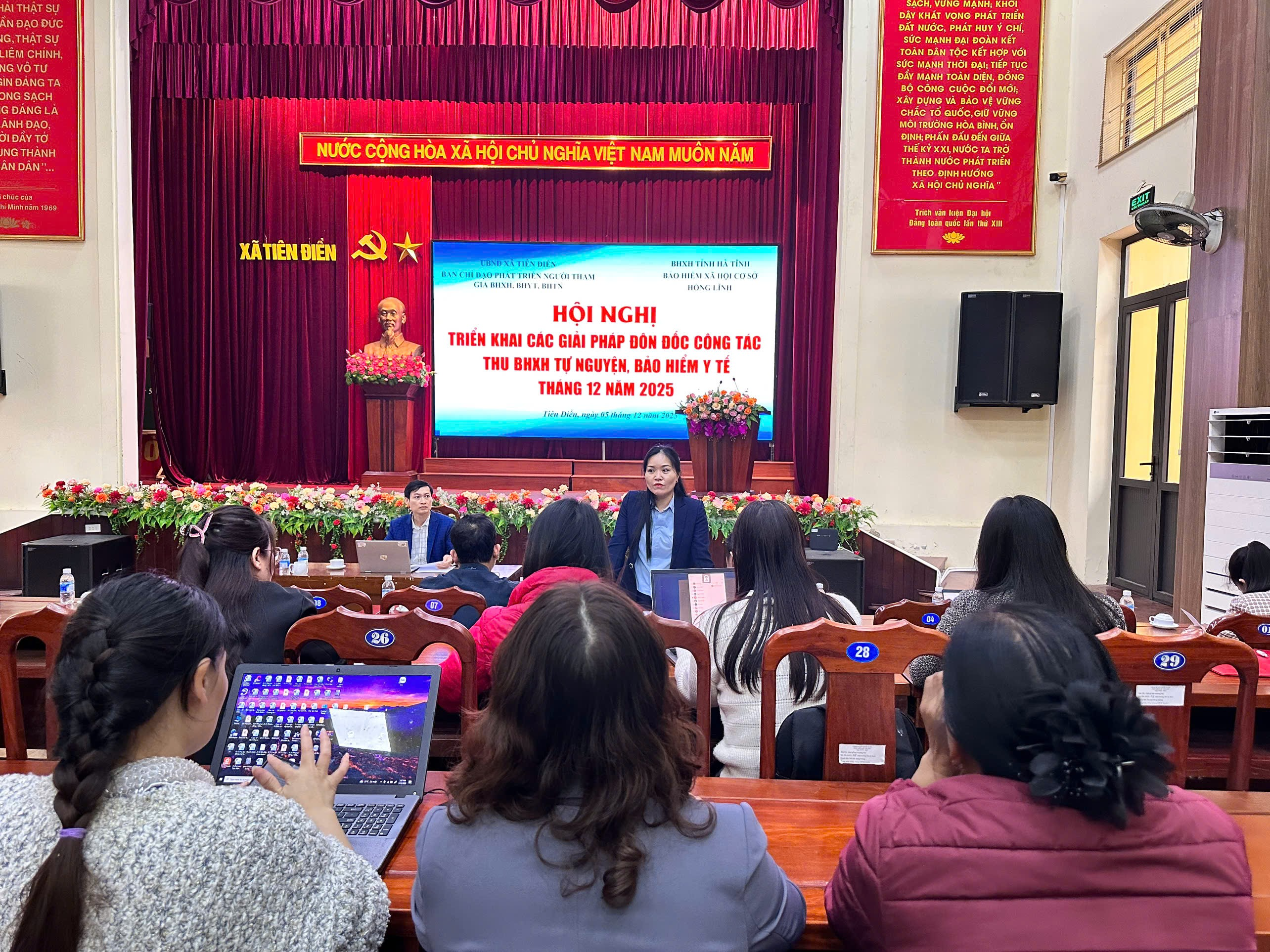 Tại hội nghị, bà Lê Thị Hồng Loan- Phó Giám đốc BHXH cơ sở Hồng Lĩnh thông qua kết quả thực hiện phát triển người tham gia BHXH tự nguyện, BHYT tính đến tháng 11 và chỉ tiêu thực hiện tháng 12 năm 2025 trên địa bàn xã Tiên Điền, tập trung mục tiêu cuối năm đạt chỉ tiêu bao phủ BHYT 96%, duy trì BHXHTN 34% và tăng mới 1%, duy trì tỷ lệ BHYT học sinh đạt 100%.