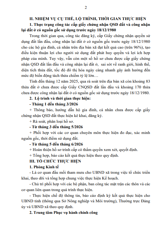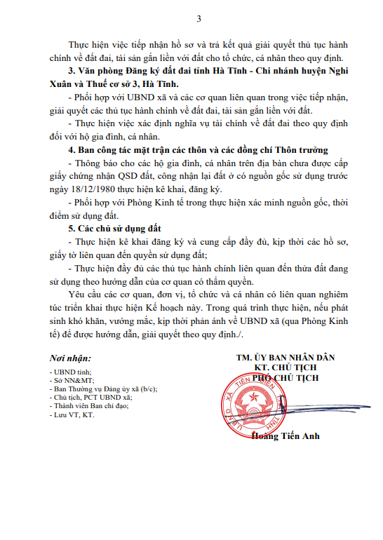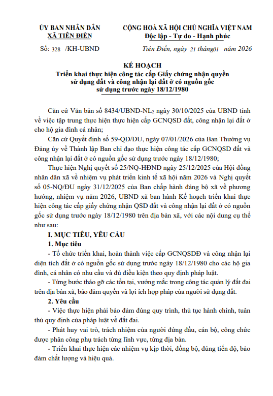 UBND xã Tiên Điền ban hành kế hoạch Số: 328 /KH-UBND Triển khai thực hiện công tác cấp Giấy chứng nhận quyền sử dụng đất và công nhận lại đất ở có nguồn gốc sử dụng trước ngày 18/12/1980