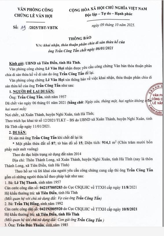 Về việc niêm yết công khai văn bản khai nhận, thỏa thuận phân chia di sản thừa kếadmin14/11/2025A -A+admin14/11/2025A -A+Về việc niêm yết công khai văn bản khai nhận, thỏa thuận phân chia di sản thừa kế[Hình ảnh] [Hình ảnh]