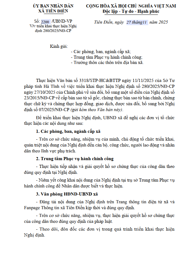 Về việc triển khai thực hiện Nghị định số 280/2025/NĐ-CP ngày 27/10/2025 của Chính phủ về sửa đổi, bổ sung một số điều của Nghị định số