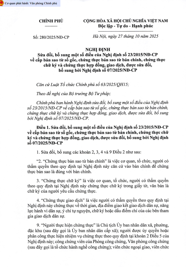 23/2015/NĐ-CP về cấp bản sao từ sổ gốc, chứng thực bản sao từ bản chính, chứng thực chữ ký và chứng thực hợp đồng, giao dịch, được sửa đổi, bổ sung bởi Nghị định số 07/2025/NĐ-CP